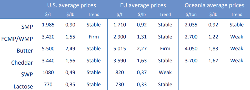 به طور معمول، در بخش تدارکات جهانی بازار لبنیات، کسب و کار است که اهمیت دارد. نیوزلند فصل شیر قوی با قیمت‌هایی مناسب برای مزرعه داران را تجربه می‌کند. رشد آمریکا با وجود نظرات مختلف درباره اقتصاد مزارع، استوار به نظر می‌رسد. تا به الان به نظر نمی رسد محرک قوی برای بستن قرارداد وجود داشته باشد. در اروپا، آمار سه ماهه چهارم  بسیار جالب است، چون این آمار نشان میدهند کمبود علف تازه تا چه حد جدی است. تا به الان، دلیلی برای نگرانی وجود ندارد. خطوط ارتباطی در سال ۲۰۱۷ برقرار شده و با وجود قیمت‌های خوب فعلی پروتئین و قیمت‌های متعادل چربی، بازار واردات تمایل به حفظ این خطوط ارتباطی دارد. انتظار می‌رود تولید شیر چین در سال ۲۰۱۹ کاهش پیدا کند و تقاضای واردات را افزایش دهد. هنوز نشانه ای مبنی بر کمبود وجود ندارد، زیرا قیمت بازار WMP این هفته کاهش قابل توجهی داشته است. قیمت کره اروپا تثبیت شده ولی بسیار بیشتر از سطح بازار جهانی است. دامنه قیمت پروتئین که از اروپا نشات گرفته، به دلیل دخالت های مداوم کمیسیون اروپا،  هنوز رقابتی ترین بازار است. از آن جایی که قیمت ها مورد پسند مزرعه داران بوده و مصرف کنندگان از قیمت خرید راضی هستند، به نظر می‌رسد بازار به کمی تعادل دست یافته است.