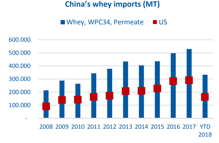 ایالات متحده بعد از سالها تلاش برای برقراری ارتباط با بازار لبنیات چین، که کاملا تحت تسلط فرآوران اروپا و اقیانوسیه قرار گرفته، توانسته به پیشرفت‌های قابل توجهی دست پیدا کند. با اینکه بعید است ایالات متحده بتواند جای نیوزلند را به عنوان بزرگترین تامین کننده شیرخشک چین بگیرد، فرآوران آمریکایی در گسترش بازار پروتئین آب پنیر چین موفق بوده اند. واردات آب پنیر چین نسبت به دهه گذشته، رشد سالانه ۱۱% داشته که بخش بزرگی از این رشد، صرف مواد خوراکی شده است. ولی با توجه به تخمین‌هایی که از گزارشات شرکای تجاری به دست آمده، در چین، واردات آب پنیر از آمریکا درماه سپتامبر ۱۶% کمتر از سال گذشته بوده و واردات از اروپا افزایش داشته تا جبرانی برای این کاهش باشد. از ژانویه تا سپتامبر، با وجود افزایش معتدل تعرفه‌ها، صادرات کنستانتره پروتئین آب پنیر(WPC) با پروتئین ۸۰% یا بیشتر، ۲۶% افزایش داشته است. با وجود تقاضای رو به افزایش WPC چین، احتمال اینکه تعرفه‌ها تاثیر منفی بر تامین کنندگان آمریکایی داشته باشد، کم است.