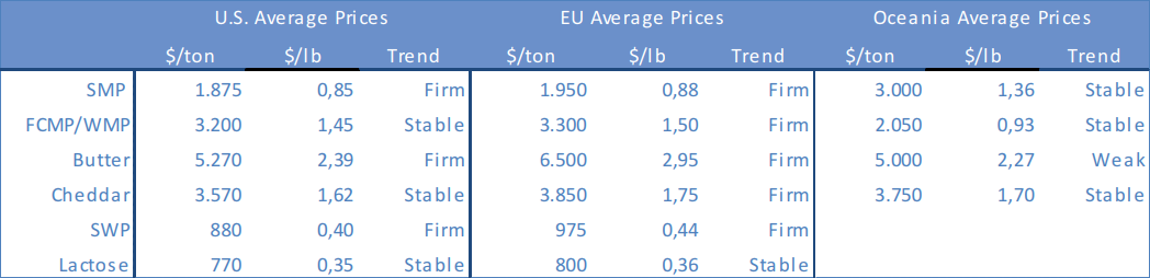 رشد جهانی تولیدات شیر هنوز مثبت است، ولی چندان متقاعد کننده نیست. به خصوص اروپا که هوایی داغ و خشک دارد. همچنین، پیش بینی‌ها در آرژانتین، برزیل و استرالیا نیز چندان خوش بینانه نیست. از طرف دیگر، نیوزلند  با مراتع وسیع و قیمت شیر مناسب، خود را برای فصل تولید شیر آماده می‌کند. آخرین اعداد به دست آمده از تولیدات شیر در چین، مثبت به نظر می‌رسد، با این حال در چین نیز نگرانی‌هایی در مورد آب و هوا وجود دارد. تولید شیر در آمریکا هر ساله تقریبا ۱% افزایش می‌یابد.  با توجه به افزایش تولید شیر، در کنار بازار پنیر سالم، انتظار داریم مقدار شیر کمتری برای تولید پود اختصاص داده شود. با این حال، خریداران برای تهیه نیازهای خود عجله‌ای ندارند، زیرا پوشش بازار به اندازه یا کمی کمتر از حد نرمال است. اخیرا دولت هند به شیر کم چرب، یارانه صادراتی اختصاص داده تا مازاد سهمیه محلی وجود نداشته باشد، ترکیه نیز قادر به رقابت در عرضه این محصول است. این موضوع  در کنار ۳۰۰۰۰۰ لیتر شیر کم چربی که هنوز در اختیار اتحایه اروپاست، از دلایل آرامش خریداران شیر کم چرب با وجود تولید نزولی و محدود است. پودر شیر هنوز در اقیانوسیه و آمریکای جنوبی آماده و در دسترس است، بخشی از این موضوع به دلیل مشکلات واردات در الجزایر است. همه این موارد در کنار هم نشان دهنده دوره‌ای جالب توجه در آینده است.