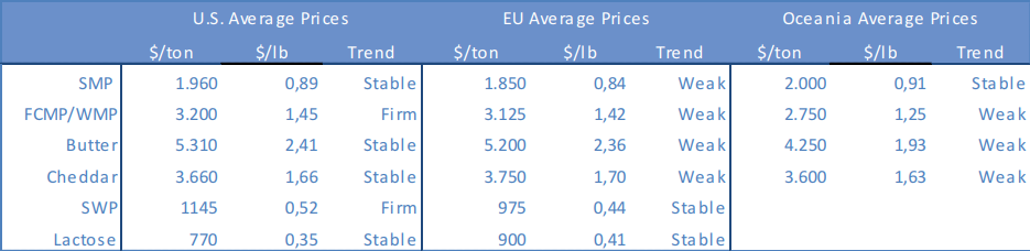 قیمت شیر در همه نواحی اساسی تولید شیر سود آور بوده و بسیاری از شرکت کنندگان در این بازار انتظار دارند تولید شیر در ماه آینده بسیار خوب باشد. مخصوصا نیوزلند که از ابتدای فصل، شروع خوبی داشته و حجم موجود را افزایش چشمگیری داده است، خصوصا شیرخشک کامل که قیمت را در نیوزلند در جند هفته پیش کاهش داده است. تقاضای جهانی برای شیرخشک پر چرب مناسب بوده است. در اروپا به علت خشکی و داغی هوای ماههای تابستانی، هنوز نگرانیهایی درباره وجود علف تازه وجود دارد و تاثیر این موضوع خود را اوایل ۲۰۱۹ نشان خواهد داد. بازار جهانی محصولات چربی دار تحت فشار است، هم از جانب کره و هم پنیر. بازار شیرخشک کم چرب و بدون چربی ۲ بخش دارد. ایالات متحده و نیوزلند ظطح کاملا سالم و متعادلی داشته اند، در حالیکه بازار اتحادیه اروپا رقابتی ترین ناحیه بوده و در زمان کوتاه، به نظر نمی رسد قیمت ها افزایش شدیدی را تجربه کنند. با این حال، قیمت ها باید به مرور زمان اصلاح شوند. سوال بزرگ این است که آیا قیمتهای اروپا افزایش خواهند یافت یا نیوزلند و آمریکا قیمت های خود را کاهش می دهند. قیمت پودر آب پنیر شیرین در آمریکا مقطوع است، زیرا آب پنیر بیشتر و بیشتری به کارخانه ها سرازیر می شود.