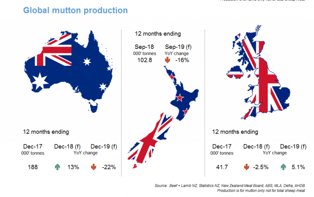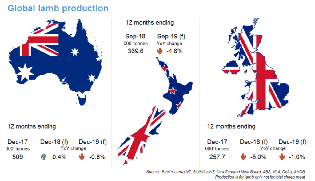 عرضه کلی صادرات گوشت بره نیوزلند محدودتر شده و پیش بینی می شود مابین اکتبر ۲۰۱۸ و سپتامبر ۲۰۱۹، کشتار گوسفندان به اندازه ۴% کاهش یابد. تعداد گوسفندان ماده نیز کاهش قابل توجهی داشته و هر سال ۱۴% کمتر از سال قبل بوده است. با این حال این تعداد وابسته به قیمت و در دسترس بودن علوفه موجود و قیمت گوشت است.