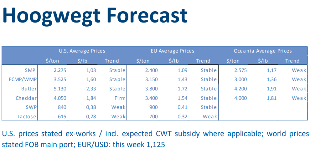 With many people enjoying their summer vacation, the dairy market seems to have cooled down. Both In Europe as in USA we see stable prices for most dairy commodities. In NZ the last GDt showed price decreases for all products. Milk production in the 11 main exporting countries shows a negative growth YTD (compared to an average growth of 1.4% in the last 5 years). However, demand for dairy commodities still has not been strong enough to push prices significantly up. In WMP we see that Chinese demand is not able to compensate decreased consumption in Algeria which is suffering from a government budget deficit and replacement by fat filled powder in Africa and Middle East. Butter market in Europe has stabilized at the lowest price in the last 3 years, but it is unsure whether there is still further downside left. Political tensions between the European Union and Indonesia (and maybe Malaysia as well) might cause significant swings in trade flows of SWP and SMP from EU to USA. Indonesia currently already buys SMP in USA and Oceania, but is much more dependent on EU for the SWP. In general market feels fairly balanced for most products and no major swings are expected, but as most products are thinly traded, relative small adjustments in supply or demand can have a strong effect.