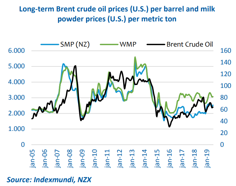 Crude oil prices continue to have a significant bearing on the world economy and consequently on dairy supply and demand, but the relationship between the two has been changing. For a long time, crude oil prices and the price of several dairy products, including skim milk powder (SMP) and whole milk powder (WMP), were closely correlated. However, the relationship between crude oil prices and commodity milk powder prices has been far less evident since 2015.