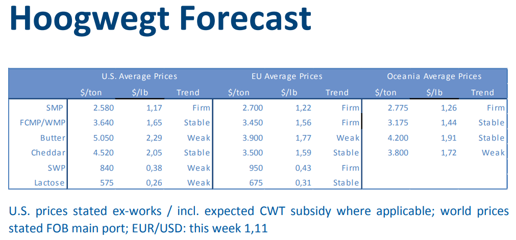 Global milk production still not very strong; all major milk producing area’s are more or less on par with last years levels. And short term no significant increase can be expected. Europe is entering their seasonal low in the milk season and in New Zealand the sub-optimal weather on the South Island is preventing an upside surprise. Butterfat continues to be under pressure, although the fall in prices seems to be slowing down. WMP prices are stable; South-American product finds its way into Algeria without too much trouble and so far China is absorbing available volumes from New Zealand. In Europe little WMP is produced at the moment. SMP market has been most active product in recent weeks and showing solid price increases. European Government Intervention Stocks are steadily disappearing from the market and spot availability is very tight, so no short-term correction can be expected. Majority of Q1 SMP business still needs to be concluded, but it is uncertain if market can afford todays prices which are higher than we have seen in the last 3-4 years. SWP market in Europe has tightened, but as Asian demand is not strong yet it might take some time before prices can really start moving up. All in all quite some mixed signals in the market and uncertainty about what prices will be in 2020.