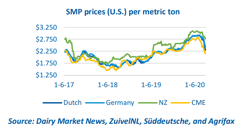 Nothing in recent history has hit the international dairy supply chain so forcefully and quickly as the COVID19 pandemic. The public health crisis, which engulfed the global dairy industry just when the long awaited milk price recovery was starting to take hold, has disrupted supply chains, temporarily putting demand and prices into a free fall. Between Jan. 31 and March 31, Dutch and German SMP prices lost more than 20% of their value and butter prices dropped 10%. Over the same period, U.S. Cheddar blocks, butter, and nonfat dry milk prices declined 30%.
