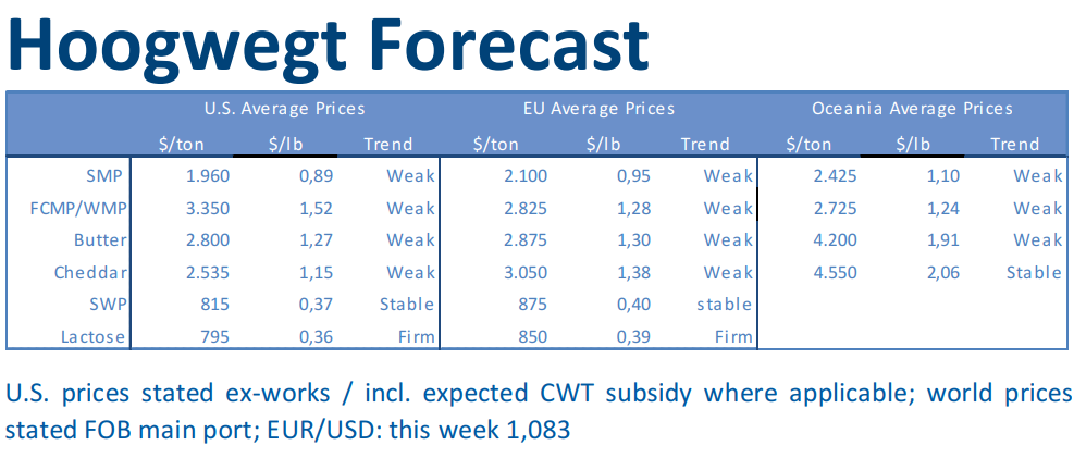 Since the global spread of Covid19 the overall global demand for dairy products has decreased. Demand fall out started in North Asia, followed by the rest of the world with a huge drop of demand in the food service industry. This drop in demand seems to be inevitable, the question remains, when will the supply side adapt to this decreased demand? US farm gate prices has dropped significantly and the financial burden will be expected in the months to come. However, milk production is not very likely to drop significantly given the governmental support. In the EU processors starting to adjust their prices of raw materials. Farm gate prices are still ok, general expectation is that this will decline into Q2. Expected effect on milk production is limited, since most of the farms aren’t taking output decreasing measures when the prices are falling. The current drought in the EU is likely to have a larger effect. Although farm gate prices in NZ are expected to be a lot lower the than the previous season, overall expectation is that prices will be sufficient for farmers. Latin America is expected to have a 2% increase in production as last year, although uncertainty is there because of the ongoing draught and the current economic circumstances.