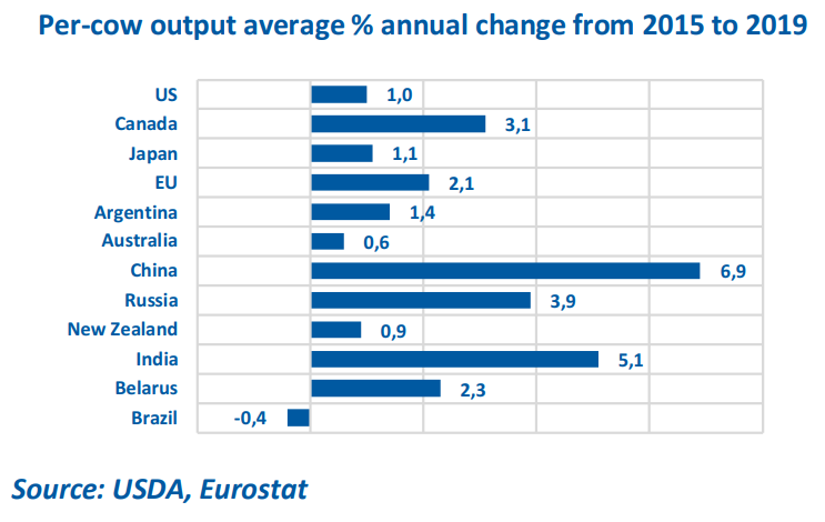 Milk output from the top 12 dairy exporters grew 1.8% in the first seven months of 2020, helped by the mild European winter,better seasonal conditions in Argentina and Australia, and favorable global feed grain prices. In China, the milk supply grew by a staggering 8% in the first half of 2020, according to the Ministry of Agriculture. However, in the last five months of this year, global milk output growth is expected to slow somewhat.