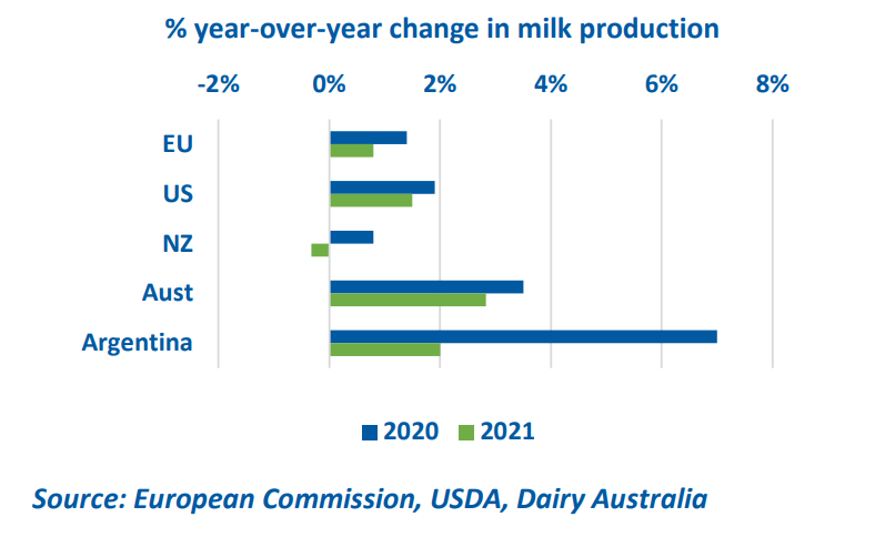 صادرات شیر اتحادیه اروپا در سال ۲۰۲۰ در مقایسه با سال های گذشته، از غلبه کمتری برخوردار بوده. رشد مجموع تولید نیز کمتر از حد انتظار بوده و نرخ رشد جزئی و نا امید کننده ای داشته است. صادرات جهانی تا حد زیادی به ایالات متحده آمریکا تکیه کرده بود. رشد تولید آمریکا در ماه نوامبر بیش از ۳% بوده که بیشترین نرخ رشد در سالهای متمادی است. در اقیانوسیه تا به حال شاهد فصل تولید بسیار قوی بوده ایم. ولی به علت تولید استثنایی سال گذشته، رشد سالیانه چندانی نداشته است. با این حال می توان نتیجه گرفت اقیانوسیه موفق به داشتن دومین فصل قوی متمادی شده است.