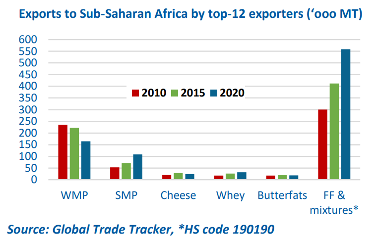 As one of the region’s more developed domestic dairy industries,South Africa produced 3.3 billion kilograms (7.3 billion pounds) ofmilk in 2019. The country is the region’s second largest importer,followed by Senegal (largest importer of fat-filled products),Ghana, and the Ivory Coast.