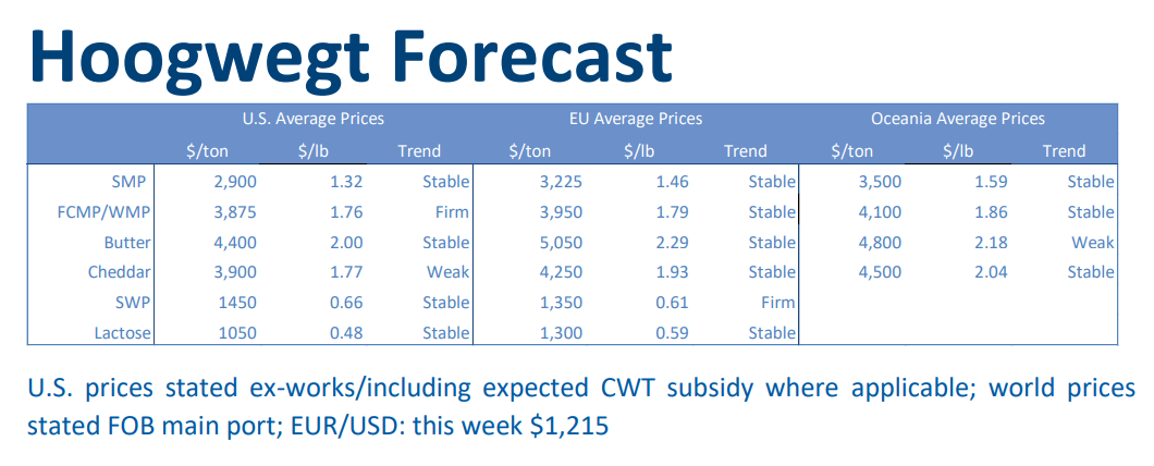 تولید جهانی شیر در حال رشد است. رشد در چارک اول سال حداقل بود، چرا که تولید بیشتر آمریکا با کاهش تولید اتحادیه اروپا، که از آب و هوای نامطلوب رنج می کشید، جبران شد. با این حال، به نظر می رسد تولید شیر از آوریل تا ژوئن رشد بیشتری داشته باشد. تولید آخر فصل نیوزلند بالاست. انتظار می رود تولید شیر تا انتهای سال ۲۰۲۱ در سطح خوبی بماند. فرآوران نیوزلند قیمت شیر بالایی برای فصل جدید پیش بینی کرده اند. در آمریکا جنوبی شیر قیمت بیشتری نسبت به محصولات زراعی دارد. از نظر تقاضا، مصرف لبنیات در آمریکا و اروپا همچنان در سطح خوبی است و با اینکه انتظار می رود تاثیر کووید ۱۹ تا نیمه دوم ۲۰۲۱ کمتر شود، تغییر قابل توجهی در مصرف لبنیات پیش بینی نمی شود. واردات چین همچنان بالاست. بیشتر از نیوزلند، شیرخشک کامل و کم چرب وارد می شود. با این حال در هفته اخیر نشانه هایی از افزایش واردات به چشم می خورد. تقاضا از جانب خاورمیانه و آفریقا کمتر از سال گذشته است، که به احتمال زیاد به دلیل افزایش قیمت بوده، ولی آسیا جنوب شرقی رشد مثبت داشتند. در مجموع، کالاهای لبنی از روی ماکزیمم بازه قیمت قیمت گذاری می شوند.. در ماههای آینده ممکن است تصحیح قیمت انجام شود، ولی چشم انداز کلی برای مابقی سال ۲۰۲۱، تقریبا مثبت است.